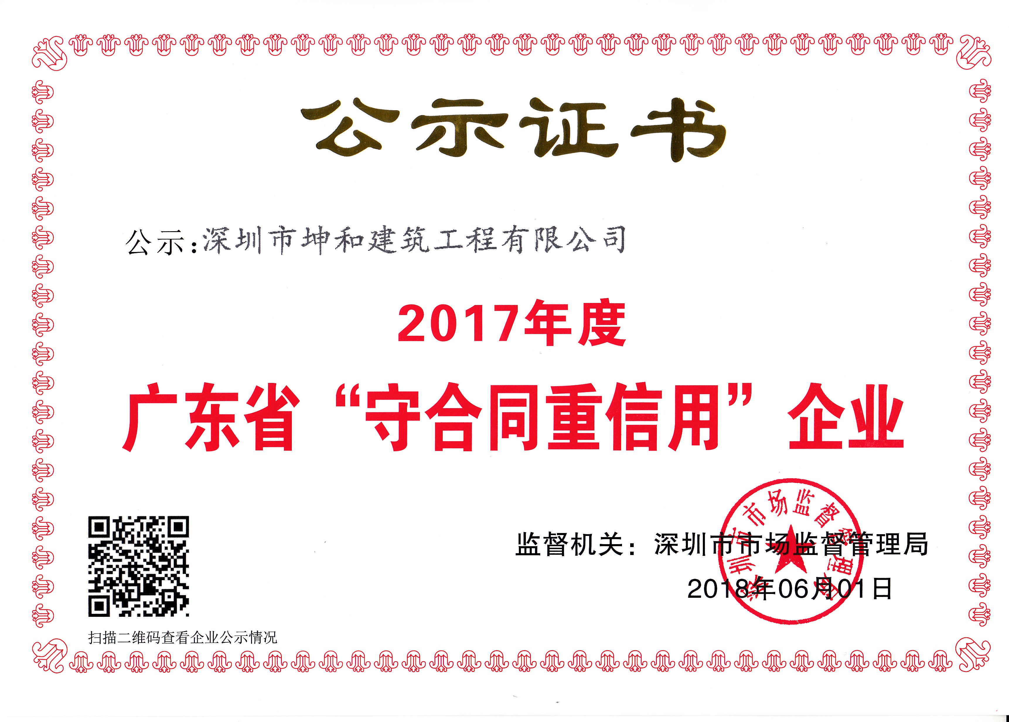深圳市坤和建筑工程有限公司于二00五年十一月廿八日成立,經(jīng)過全體員工的共同努力,公司發(fā)展迅速,目前公司注冊資金為12010萬元,是一支具有房屋建筑工程施工總承包一級;市政公用工程施工總承包一級;水利水電工程施工總承包二級;地基基礎(chǔ)工程專業(yè)承包二級;建筑裝修裝飾工程專業(yè)承包二級;建筑機(jī)電安裝工程專業(yè)承包三級;鋼結(jié)構(gòu)工程專業(yè)承包三級資質(zhì)的專業(yè)施工隊伍,并于二00六年通過了ISO9001:2008標(biāo)準(zhǔn)﹑ISO14001:2004標(biāo)準(zhǔn)﹑GT/B2800-2001標(biāo)準(zhǔn)三項管理體系認(rèn)證。